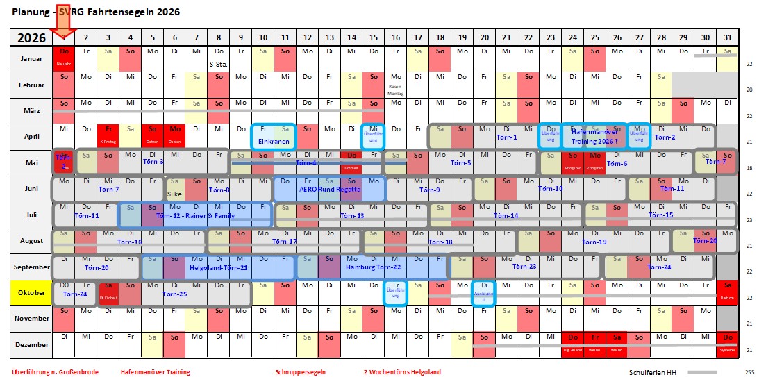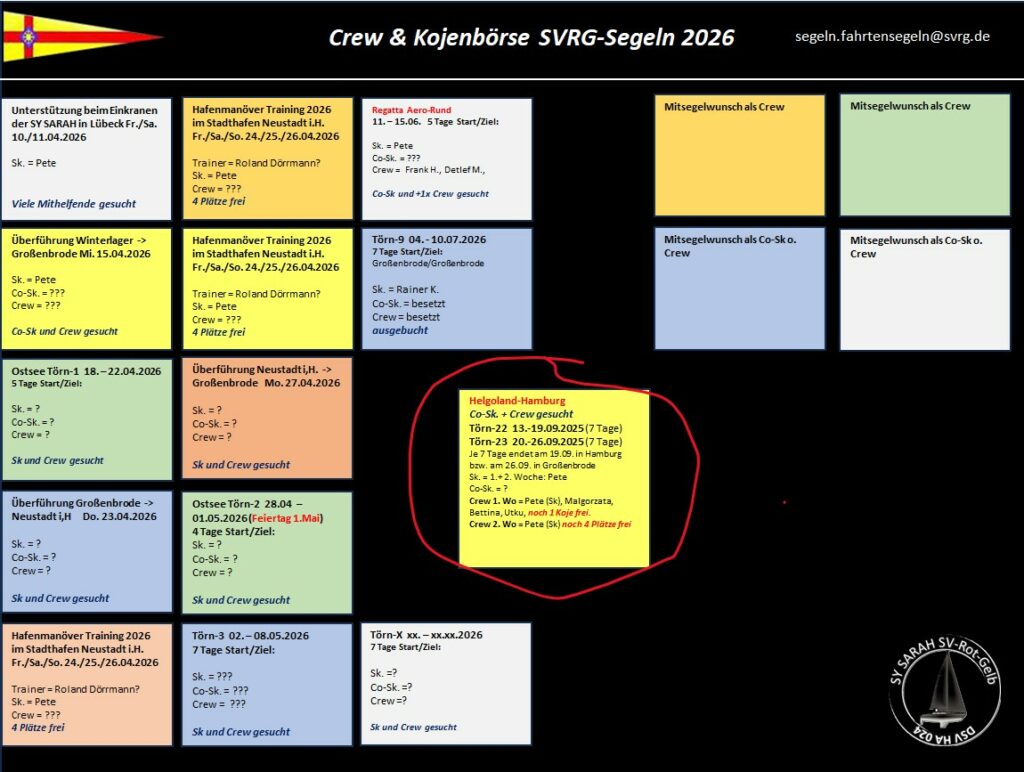 Mit diesem schwarzen Brett wollen wir eine “Crew und Kojenbörse” eröffnen, über die ihr Euch über freie Kojenplätze und Segelwünsche untereinander austauschen könnt. Um auch Deinen Wunsch auf die Infotafel zu bekommen, schreibst Du Deinen konkreten Wunsch an segeln.fahrtensegeln@svrg.de und wir aktualisieren das Infoboard hier auf unserer Website, so schnell wie möglich, (nur für freigeschaltete Mitglieder zugänglich).